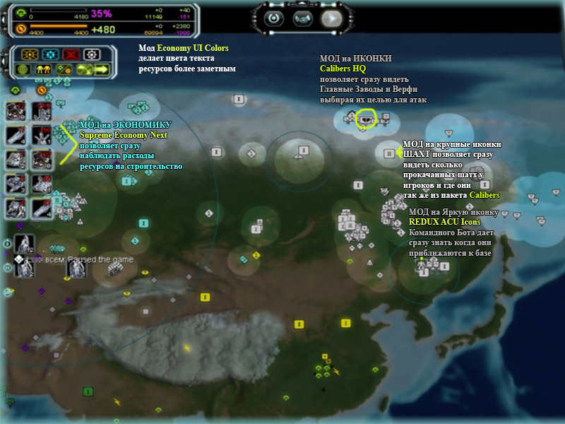 Успешной игре сильно помогут Моды на UI - сначала игроки гонятся за апдейтом графики, не обращая внимания на UI моды - а они например подсветят на стратегической карте ядерные шахты если они уже известны, что бы сразу явно понимать что у противника они уже есть! Сделают крупными иконки на добывающие установки что бы явно на стратегической карте обращать на них внимание и они не сливались с иконками юнитов постоянно напоминая где противник получает ресурсы сейчас, позволят видеть расход ресурса на процесс постройки строений и юнитов что бы принимать решение что тормозит выпуск юнитов в этот момент и было возможно временно уменьшить темп строительства чего-то для усиления выпуска армии например в период интенсивной атаки на базу - это все повышает эффективность игры в эту RTS.