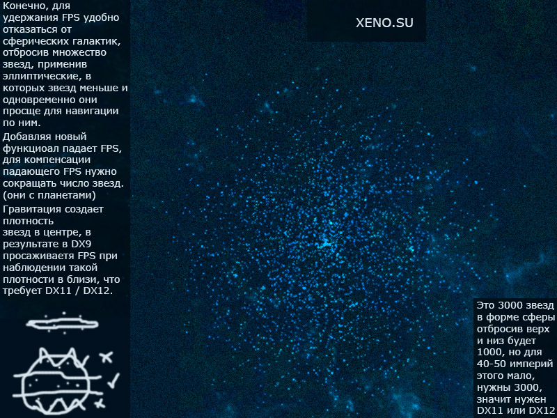 В 2D экране сложно разместить 1000 кораблей даже при нескольких слоях, умещается 40-80 или 200 кораблей что вполне легко плавно вычисляется и не создает проблем, т.е. сама плоскость экрана непозволяет в нее влететь такому числу объектов которые бы создавали проблему вычислений, в отличие от 3D где вращая камеру по всем направлениям можно увидеть бесчисленное множество объектов во всю глубину каждого направления, которые нужно отображать в реальном времени, а поместится в этих направлениях может много всего потребляющего ресурсы компьютера, либо требуется многоядерный сервер для игры а оффлайн игру реализовывать в минимальном числе цивилизаций и звезд, или нужно подключать к проекту игры физический движек работающий на видео-карте например OpenCL, а будут ли будущие поколения видео-карт поддерживать нынешнюю версию технологии CL? Что если станут выпускать такие OS и драйвера и видео-карты где будут поддерживаться только более ее новые версии и игровое решение небудет работать с новейшими видеокартами. Поэтому любая докрутка новых модулей вызывает риски нестабильности или возможные будущие сложности.