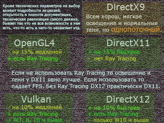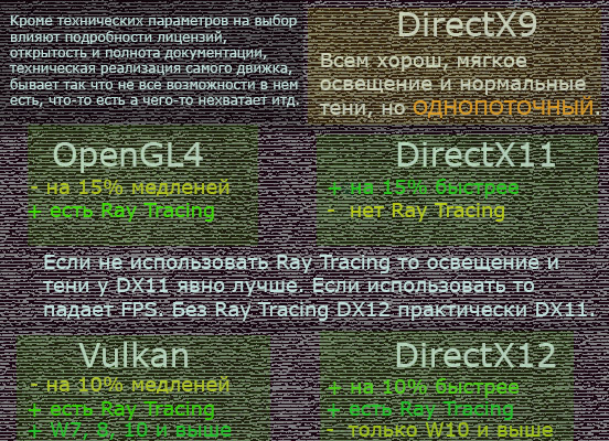 На рассмотрение попали самые новые из доступных и бесплатных вариантов для разработки 3D игры. 1. Все что с DX9 не рассматривалось т.к. медленное. 2 Все что с DX10 не рассматривалось т.к. есть DX11 который быстрее, что касается DX11 то если без Ray Tracing он вполне конкурентен с DX12, потому что с технологией RT FPS падает, и его лучше отключать, тогда это технлогия для будущих поколений видео-карт. Рассматривалось все что поддерживает начиная с DX11 и выше включая Vulkan и еще небыло отложено в сторону, осталось всего несколько вариантов для исследований - по параметры подошли 6 средств разработки включая платные или частично платные, было проанализировано все начиная с DX11 и позднее что было создано и появилось перед выходом Windows 12, кажется другого ничего и нет, а то что было уже было изучено и не подошло ранее.