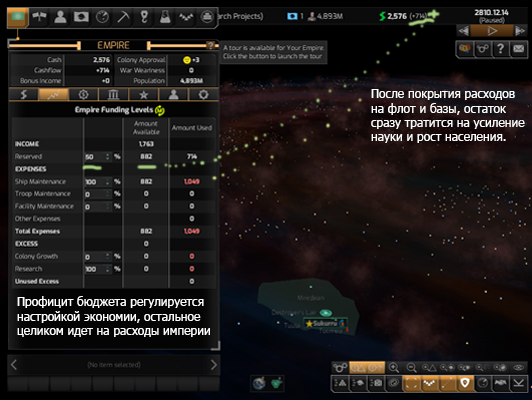 Экономика в одной из лучших игр про космос требует внимания и опыт, в бедных мирах где нет роскоши собираемый налог может составить например около 800 единиц что меньше расхода на нее, такая планета будет выедать запасы в империи. Поэтому бедные миры нужно сразу обеспечивать ресурсами для сбора хороших налогов. С ростом населения выше 50% от максимума планеты расходы на ее содержание могут увеличиваться, лучше установить политику расселения в миры где недостигнута половина максимума планеты. Лучше в самом начале отключить авто-постройку кораблей - иначе их содержание вгонит цивилизацию в долги, обнулить их дефолотом устроив кризис неполучится, в игре нет такой кнопки.